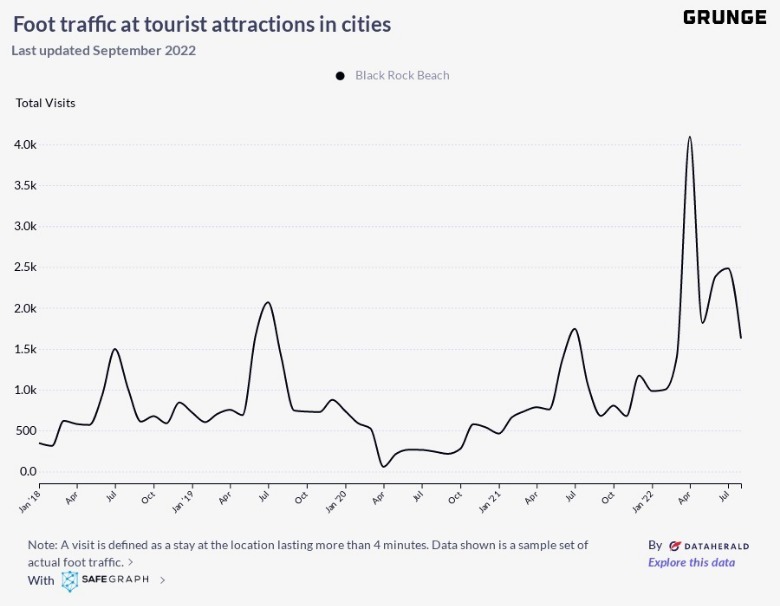 Based on foot traffic with a visit defined as lasting more than four minutes, Black Rock Beach at the north end of Ka'anapali Beach on the island of Maui gets lots of foot traffic, especially in the spring and summer months. As can be seen above, tourists on Black Rock Beach dipped during 2020, but those numbers shot up markedly in spring and summer of 2022, with 4,000 tourists stepping foot on Black Rock Beach in April and almost 5,000 over June and July. Servicing the area is the Hawaiians' second-largest airport, Kahului Airport, with an astonishing 24,000 travelers at Kahului on July 1, 2022, alone, based on Hawaiian News Now reporting. With fewer than 200,000 full-time Maui residents, most of those people were likely tourists (via the United States Census Bureau).