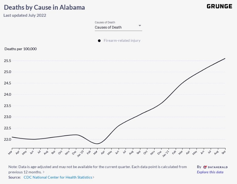 Since most gun-related mortality comes from suicide instead of homicide, what perplexes experts about pandemic-era gun violence is that while suicide rates are steady, homicide rates have gone up. As previously mentioned, that unprecedented uptick in U.S. gun violence is everywhere, maybe nowhere more so, though, than in Alabama, where beginning in March 2020, CDC data (below) reflects a sharp spike in gun deaths per capita. The root causes of gun violence are hard to identify, and many factors likely influence the issue. A look at several key demographic and statistical factors in this southern state, though, may help explain how and why Alabama has been so hard hit.